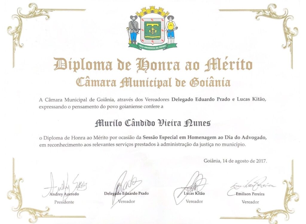 Nosso trabalho também é reconhecido pelo Poder Público, que nos conferiu Título de Honra ao Mérito pelos serviços advocatícios prestados.